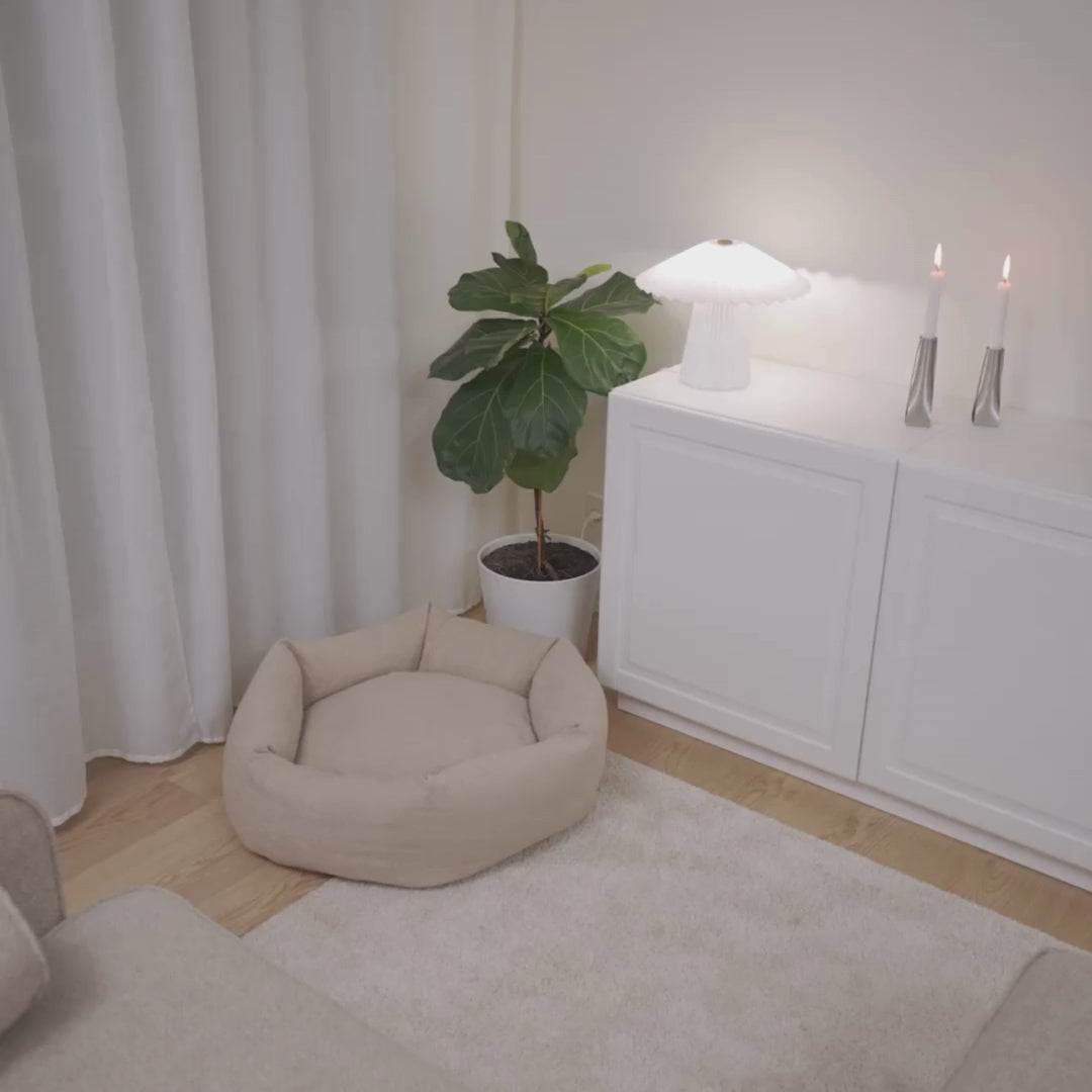 Porque no es sólo una cama para perros, es un pedazo de hogar. La forma da a los perros una sensación de calma y seguridad, y los materiales suaves les invitan a hundirse y quedarse. Los clientes nos dicen que sus perros eligen Luna en lugar del sofá (sí, de verdad) y que se integra sin esfuerzo en su interior. Es el tipo de cama que no sólo toleras, sino que la exhibes con orgullo.