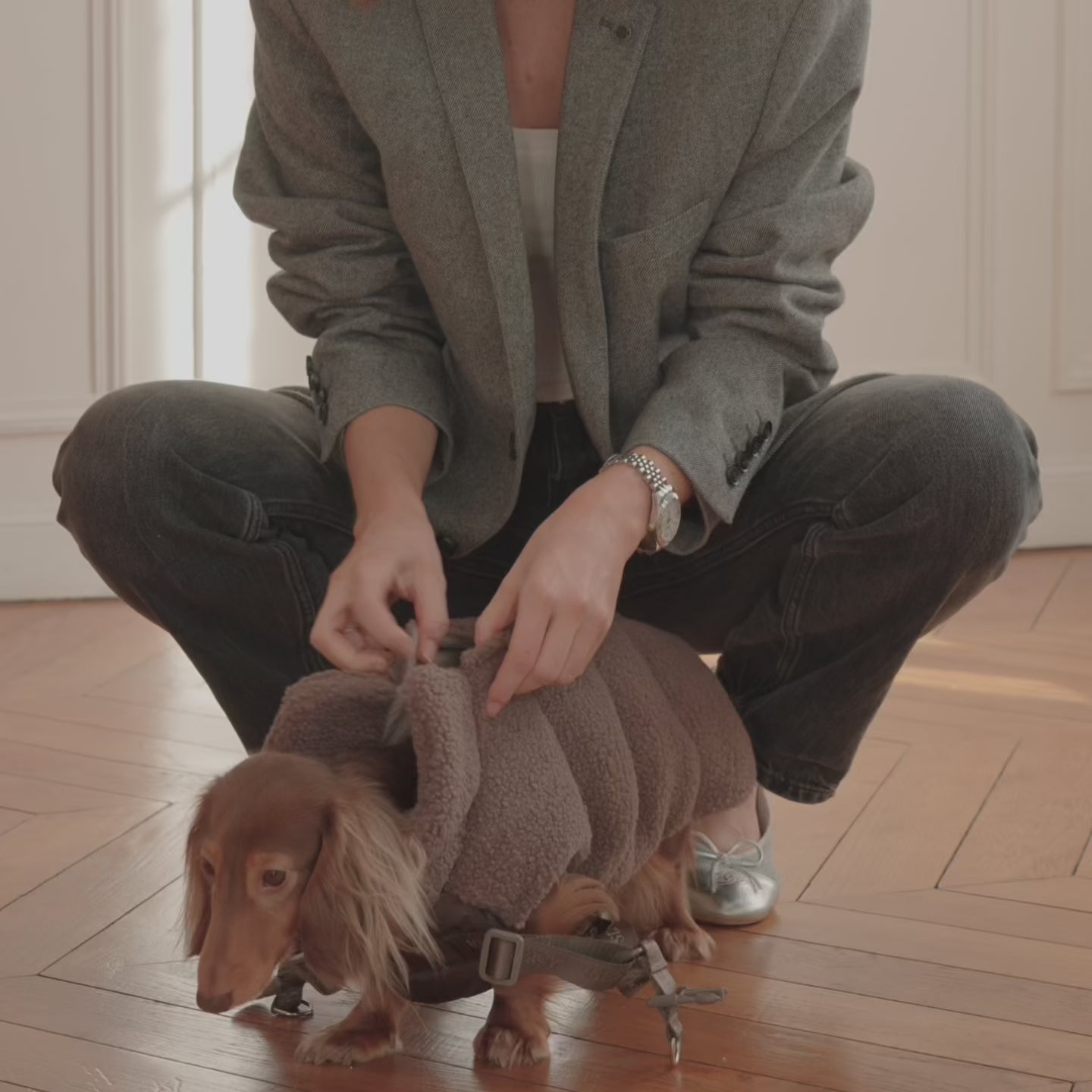 A zipper along the back makes it easy to put on and take off, while optional elastic straps for the back legs help keep the coat securely in place. The chest part is made from a practical, water-repellent material that can be easily wiped clean after muddy walks.Functional, comfortable, and effortlessly stylish — this is your dog’s new favorite coat.